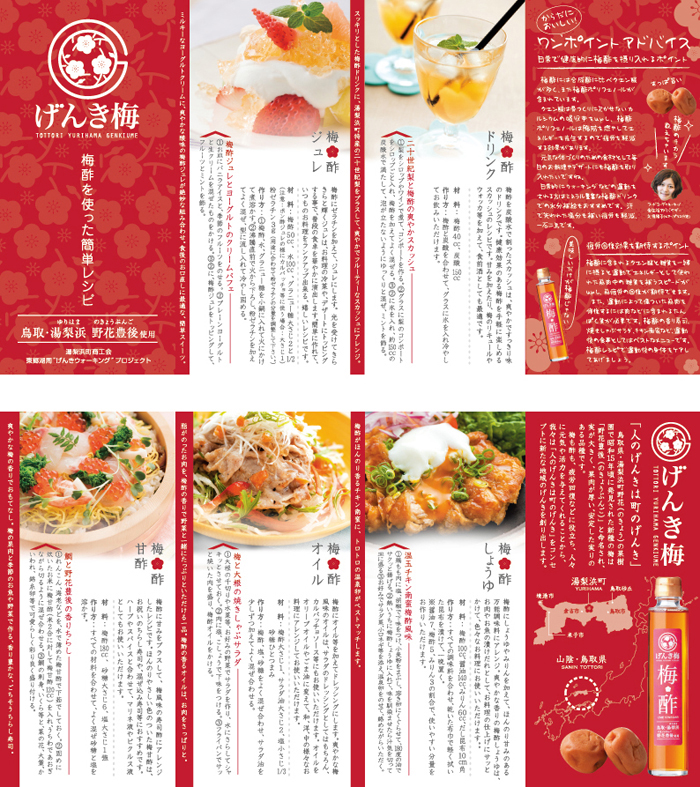 げんき梅ミニパンフげんき梅を使った簡単レシピを作成しました、フードコーディネーターさんのアドバイスを盛り込み、げんき梅の「梅酢」を使った調味料のレシピで、これを更にご家庭でアレンジして頂けるというモノです。
