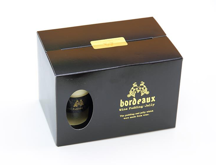 甘さ控えめ大人のプリン&ゼリー四角い箱にはシックで、尚かつ高級感を出すためにゴールドの箔押しを施しました。反対面も同様の形で穴があいていますが、片面は赤ワインのプリン、反対は白ワインのプリンが見えるようになっています。