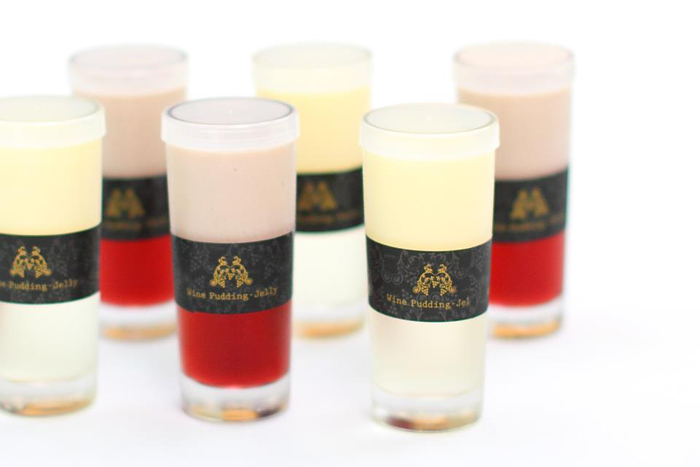 赤と白のコントラストが美味しさを際だたせます赤と白、まさにワインを彷彿とさせる2種類のワインプリンです。上にはワインの香りがふわっと香るプリンを、そして下にはさっぱりとした口当たりのワインゼリーが入っています。プリントゼリーの境界の部分にボルドーの帯を巻くことでアクセントになりワインラベルのような印象を持たせます。