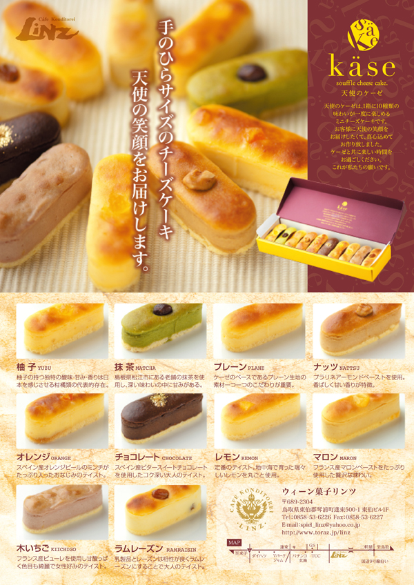鳥取県・琴浦町のウイーン菓子 リンツさんの新商品、「天使のケーゼ」(チーズケーキ)のパッケージデザインをさせて頂きました。LINZのコーポレートカラーのエンジを基調に、インパクトがあり、チーズケーキを連想させる配色と、シンプルな中にいろんな味がちりばめられているイメージを表現しています。