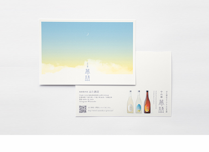 鳥取県・大山町にある「はた酒店」さんのオリジナル日本酒「夢語(ゆめかたらい)」のラベルデザインとPRカードのデザインに関わらせて頂きました。