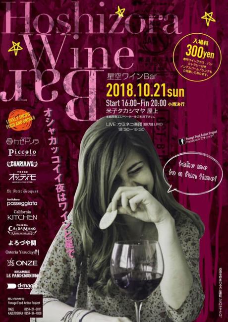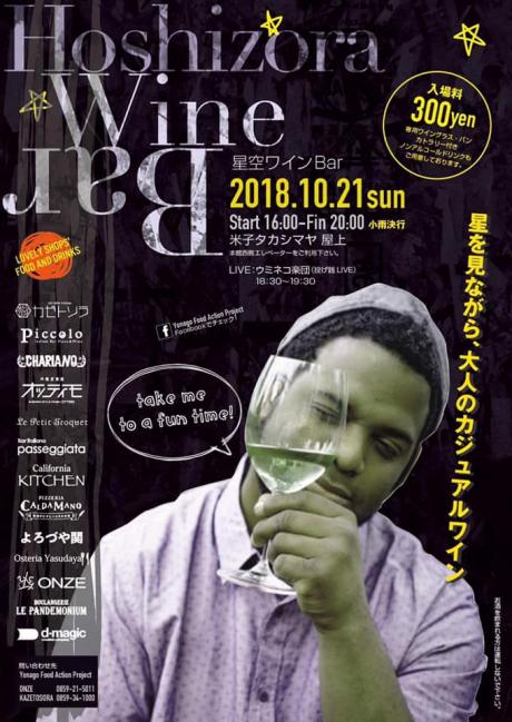 Yonago food action Projectの主催で開催された「星空ワインBar」の告知ポスター。米子市内の飲食店が腕をふるって提供する料理と、セレクトされたワインで楽しむ大人のカジュアルイベントです。