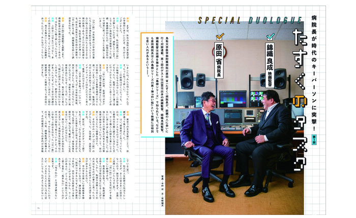 この度、鳥大医学部附属病院の広報誌がチーム丸ごと全面リニューアルされます、スーパーバイザーは読売テレビの結城豊弘氏、そして編集長はノンフィクションライターの田崎健太氏、副編集長は元雑誌の編集部で今はUSJ勤務の敏腕OL永井万葉さん、更にカメラは有名アーティストや、国際的なアスリートなど人の表情を切り取る写真が素晴らしい中村治氏と錚々たるメンバーの中でd-magicはデザインに関わらせて頂く事になりました。