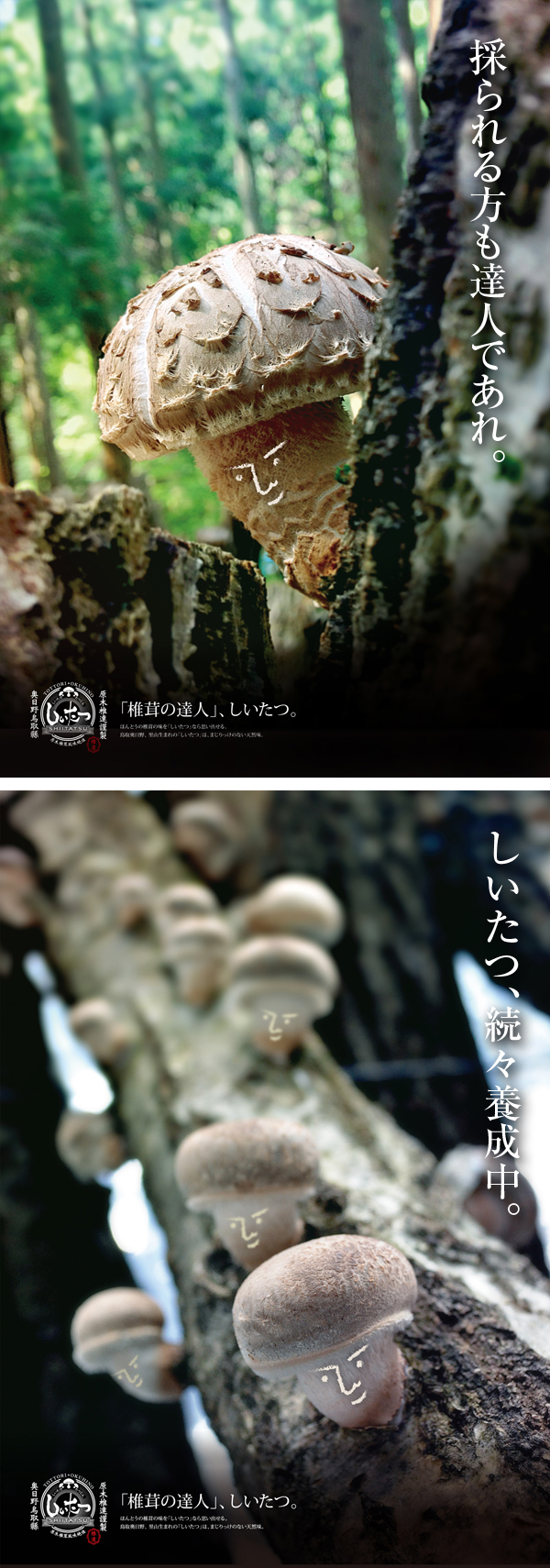 しいたつポスターしいたけ×デザインは他であまりないという事で注目を浴びている、しいたつのポスターです。しいたつとはしいたけの達人、であるならばしいたけ自体も達人であれ!というイメージで制作。従来のイメージを払拭出来るポスターだと感じています。