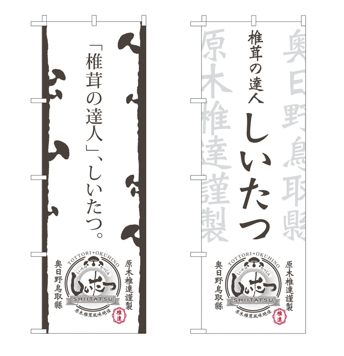 展示会・商談会用のぼり展示会や商談会にのぼりは必須です。ただロゴを大きく展開するのでは無く「しいたつ」らしさを表現したいと思い、グラフィック的にも目を引くデザインにしました。同業種(しいたけ業者)さんではなかなかお目にかかれないグラフィックなのでは?と思います。