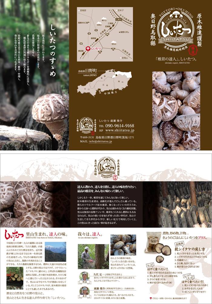 しいたつリーフレット展示会や贈答品に同封するためのリーフレットはインフォメーションには必須です。しいたつのリーフレットはどんな環境で育ったのか、そして達人がどのようにしいたけに関わっているのかを表現しています。