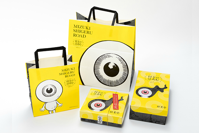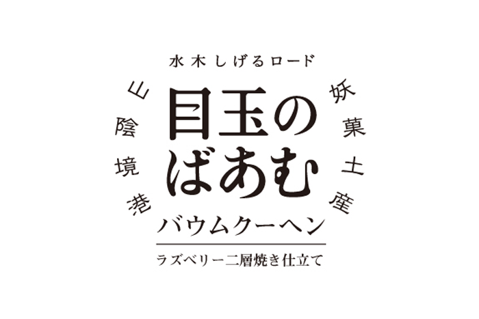 目玉のばあむRogo design&Package design鳥取県境港市にあるお土産屋さん「妖菓堂」の主力商品である「目玉のばあむ」のパッケージデザインを一新し、新たに発売を始めました。大きなホールとミニばあむのパッケージを統一化し、ショッピングバッグもテーマカラーのイエローとブラックでインパクトを与え、ロードを歩いてても気にして頂けるパッケージにしました。