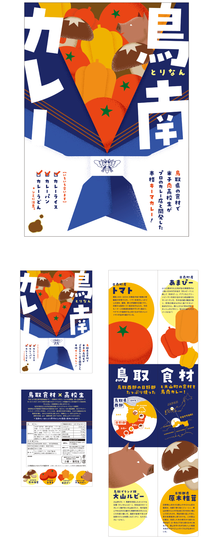 鳥南カレーパッケージデザイン鳥取県日野町JK課に所属する鳥取県立米子南高校の生徒さんで考案した、地元野菜たっぷりのカレーのパッケージを制作させて頂きました。
