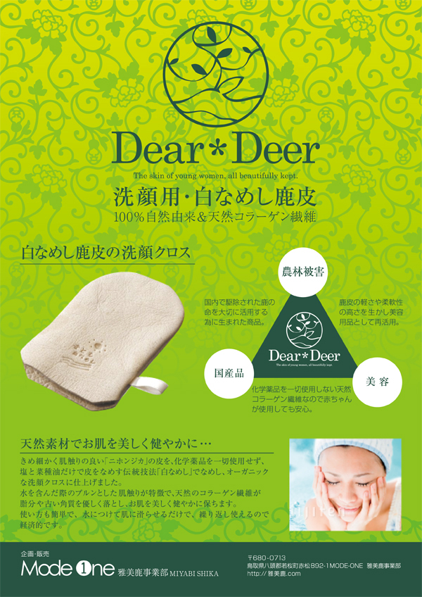 Dear*Deerロゴデザイン・ネーミングDear*Deerのネーミングは有害鳥獣として駆除された鹿の命を重んじ「親愛なる鹿」という意味を持たせている。発音が似ている事で覚えやすい。